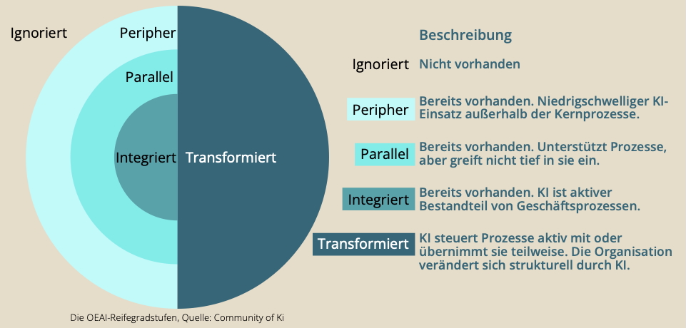Die bewusst ausgeklammerte Stufe Ignoriert stellt keine Reifegradstufe im engeren Sinne dar, sondern beschreibt Organisationen, in denen KI entweder vollständig abgelehnt oder bewusst ausgeblendet wird. Sie wird im OEAI-Modell als Grauzone geführt, nicht als eigentlicher Reifegrad.